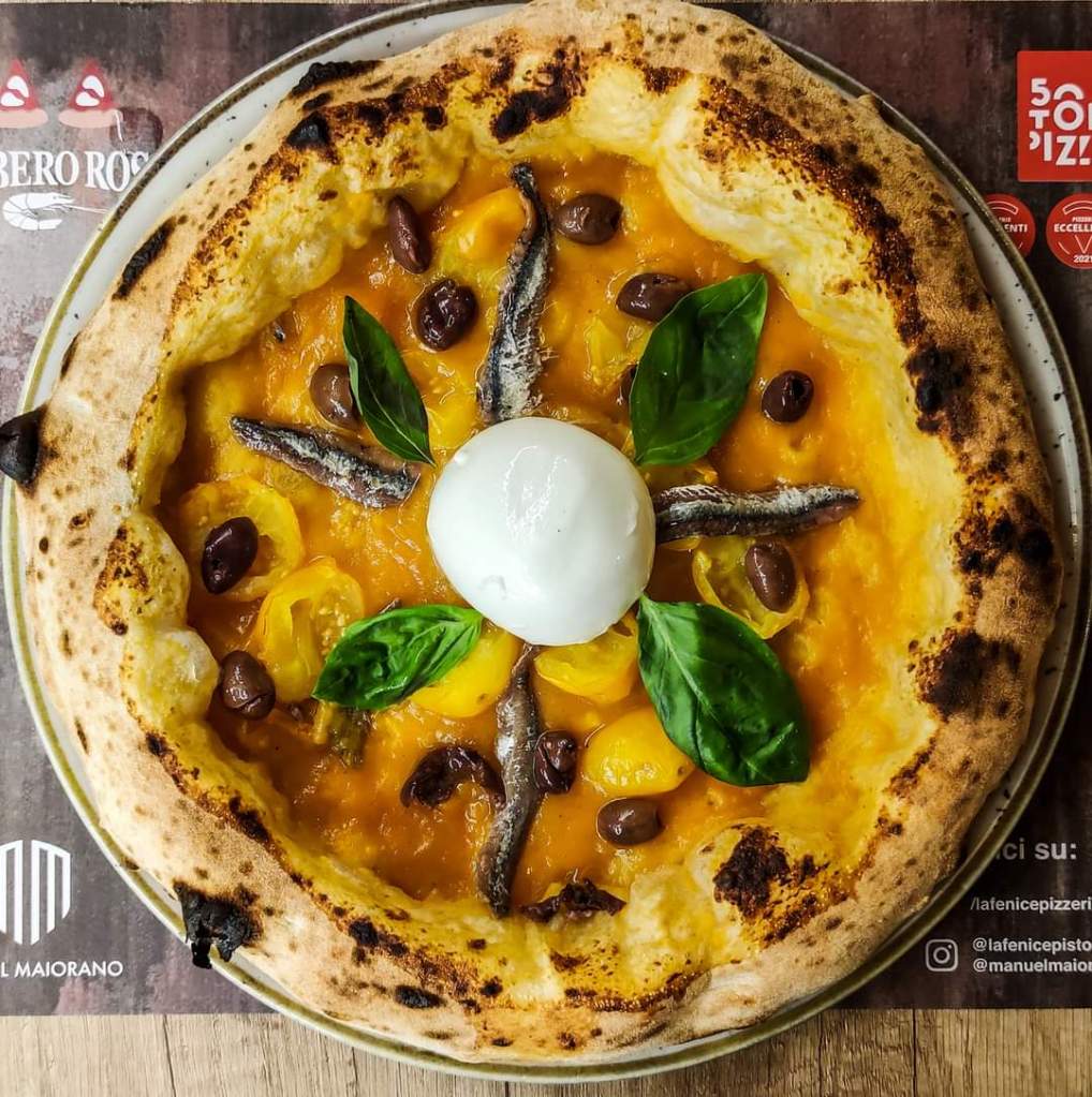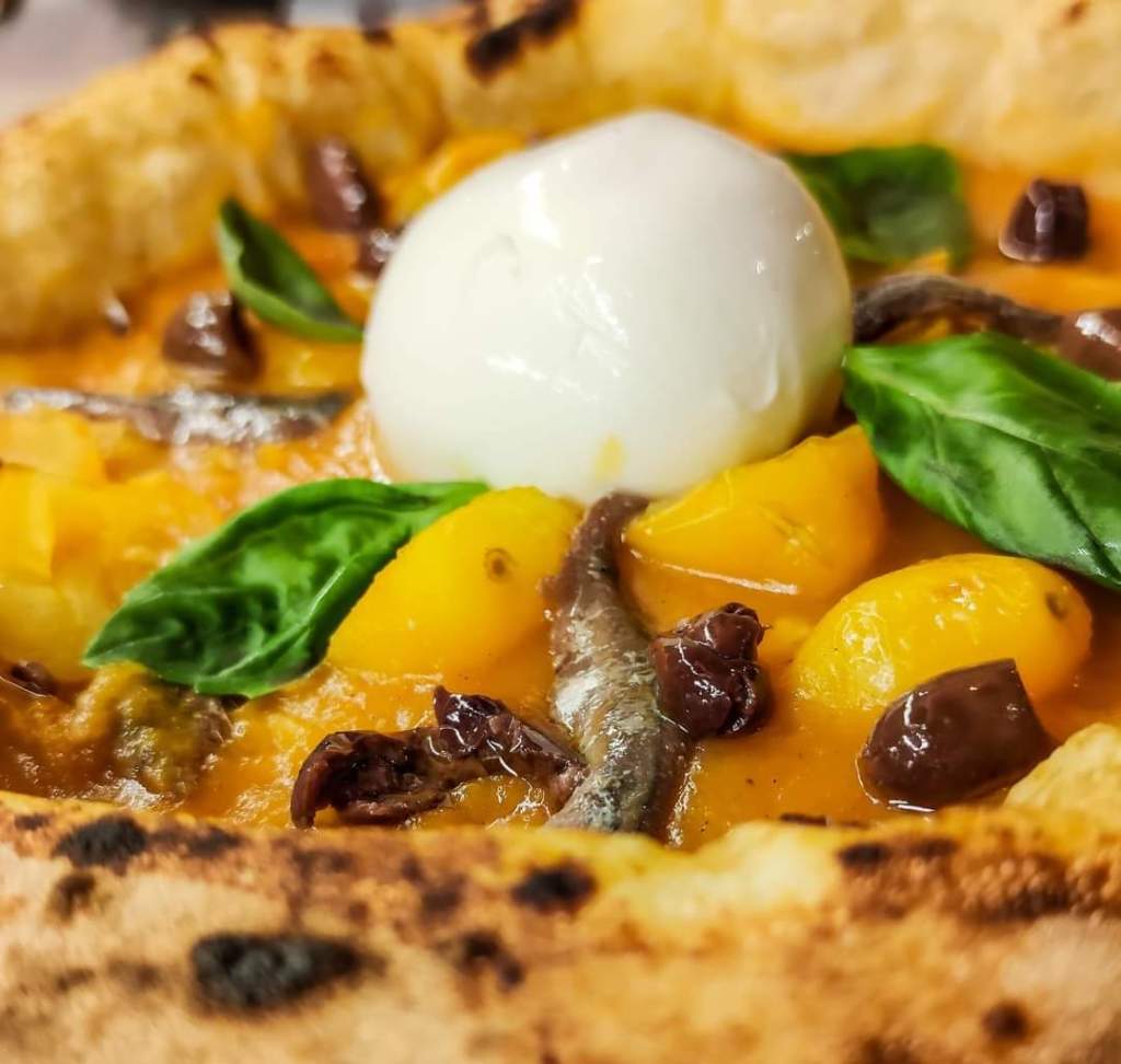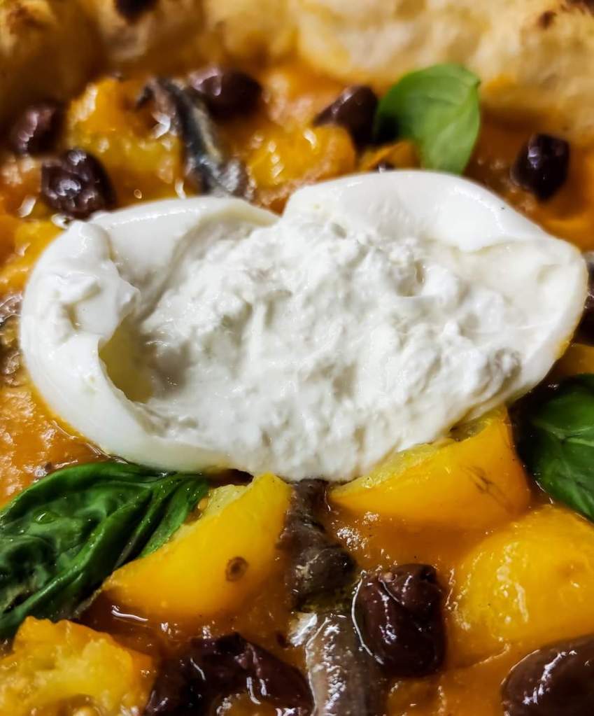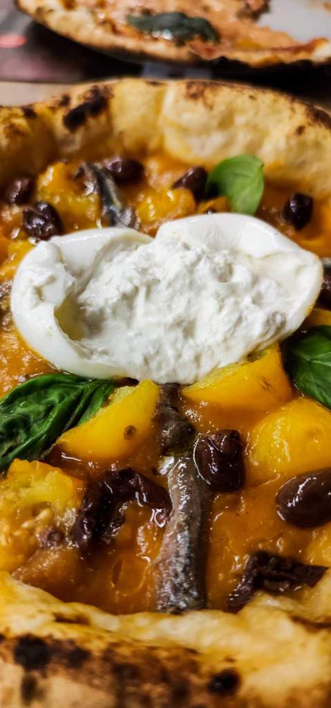 - Pizza Contemporanea (cornicione) Salsa di Pomodoro Giallo Campano, Datterino Giallo, Alici di Cetara Armatore, Olive Taggiasche, Burrata di Andria.