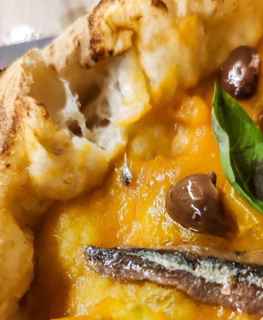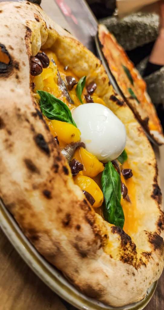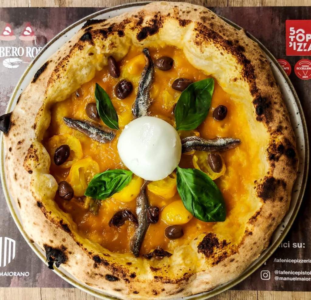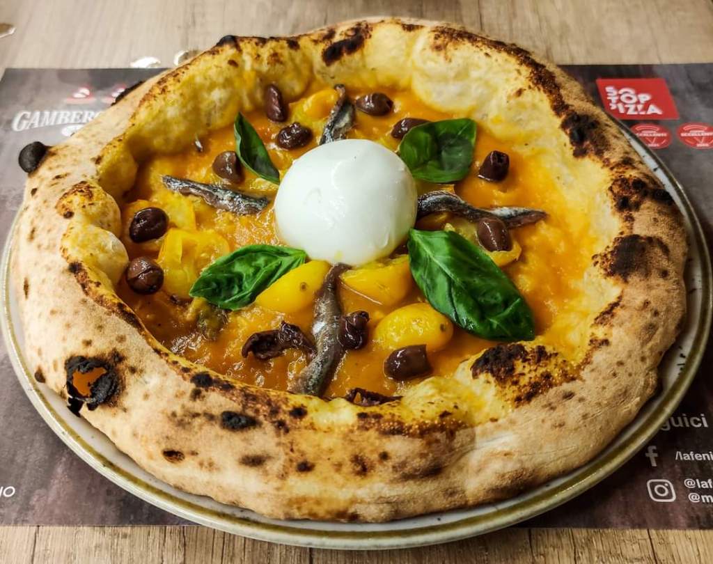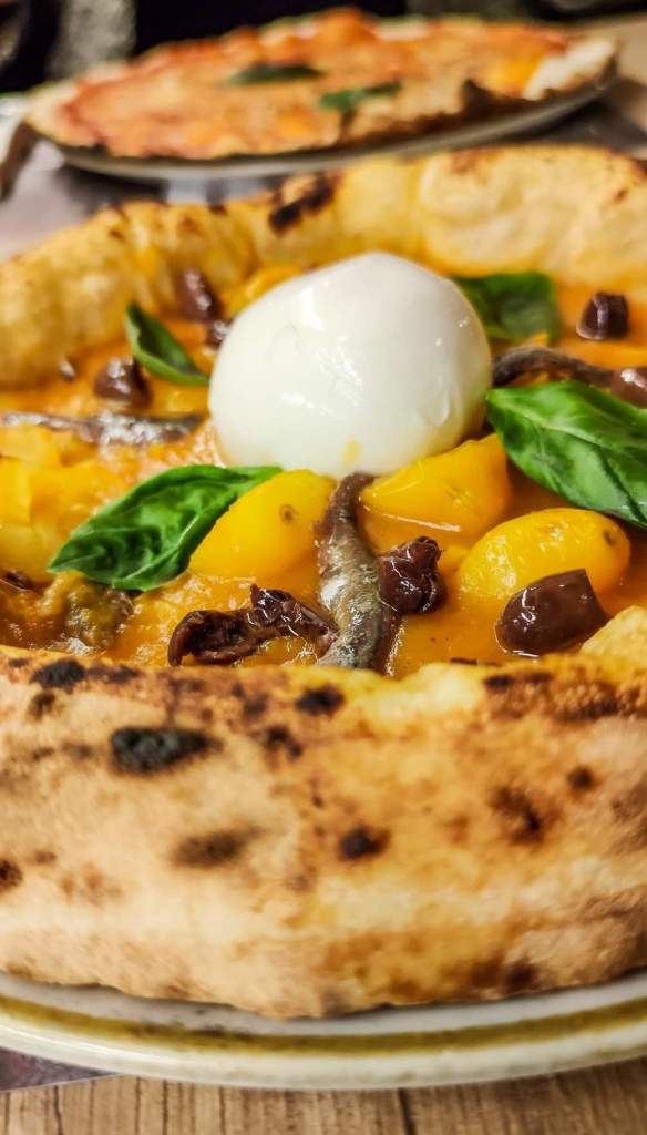 - Pizza Contemporanea (cornicione) Salsa di Pomodoro Giallo Campano, Datterino Giallo, Alici di Cetara Armatore, Olive Taggiasche, Burrata di Andria.