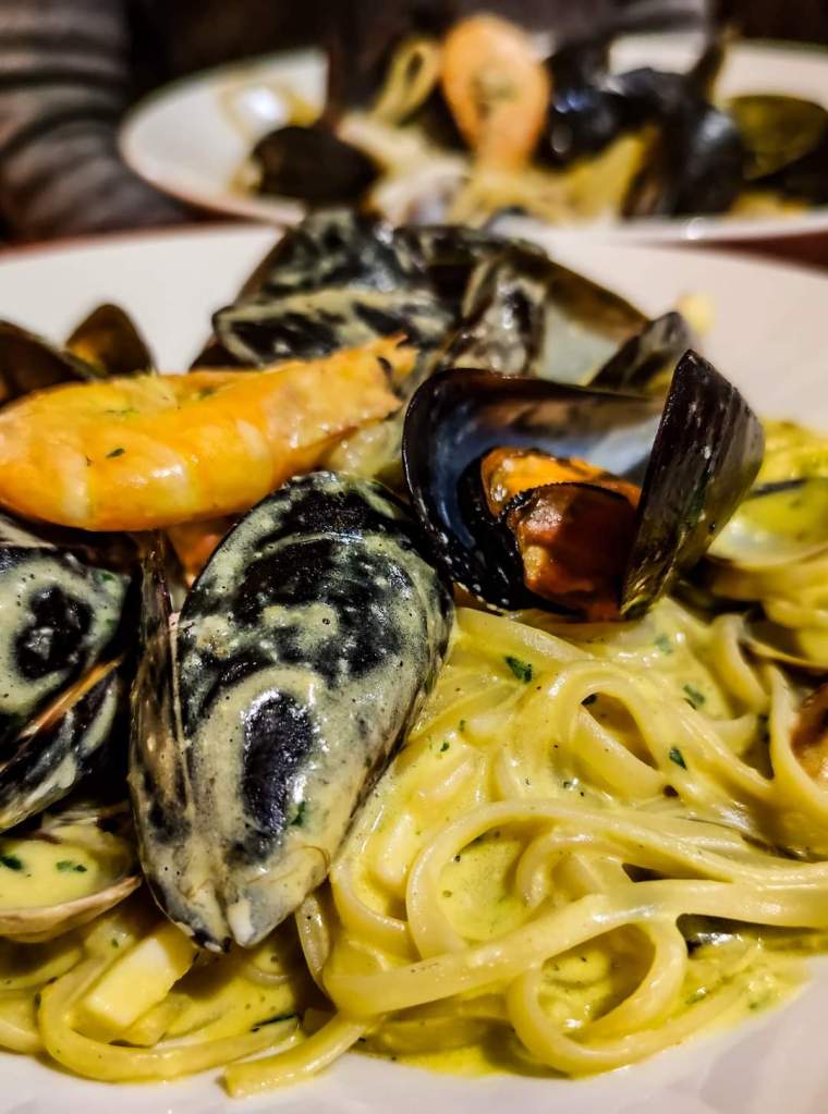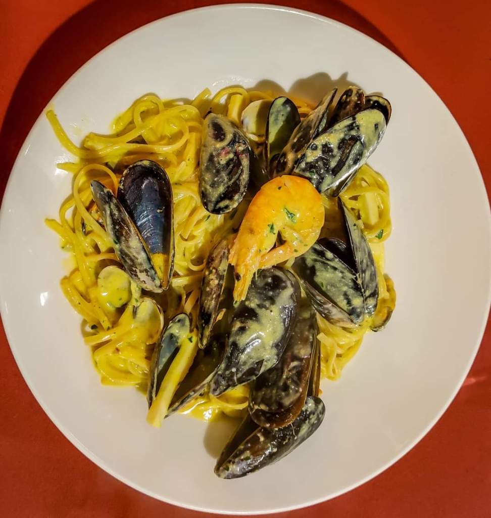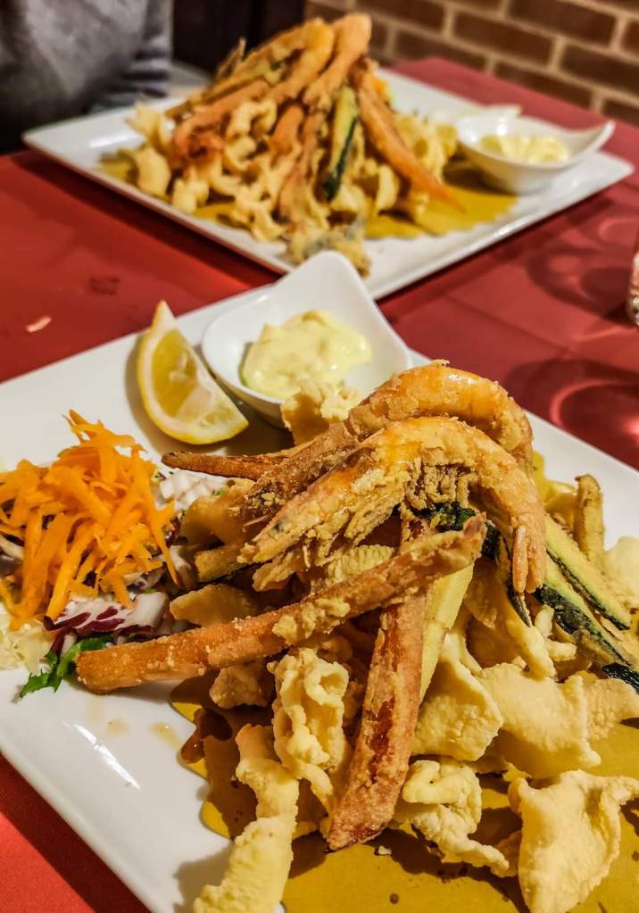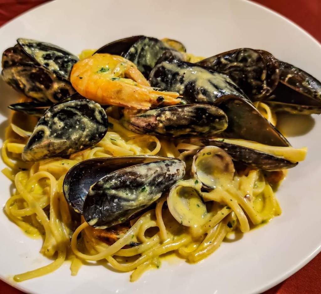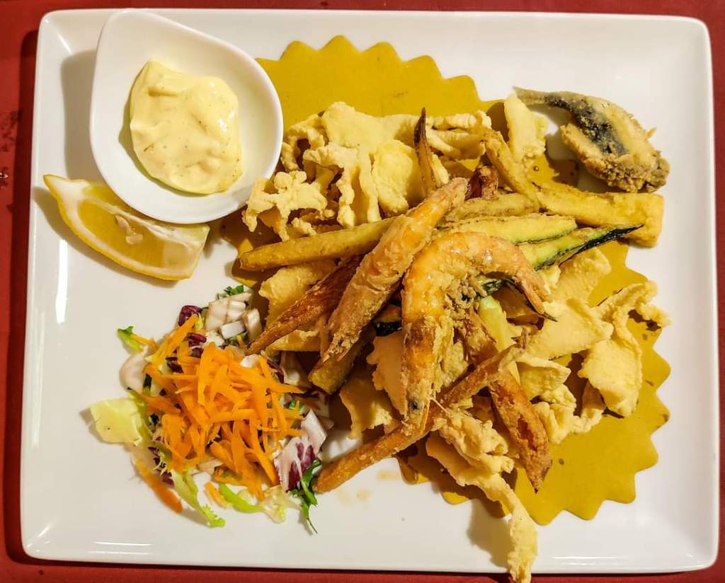 The €19 menu includes tagliolini allo scoglio or seafood carbonara and mixed fried fish and includes water, wine and coffee. There is the possibility of other dishes but with price increases.