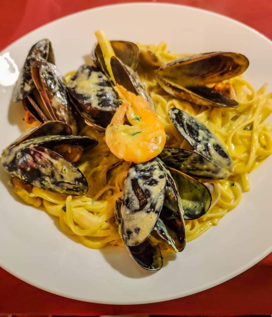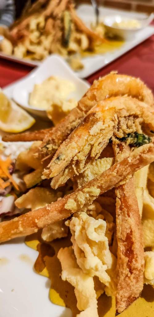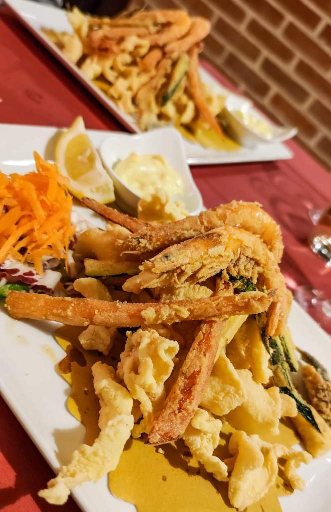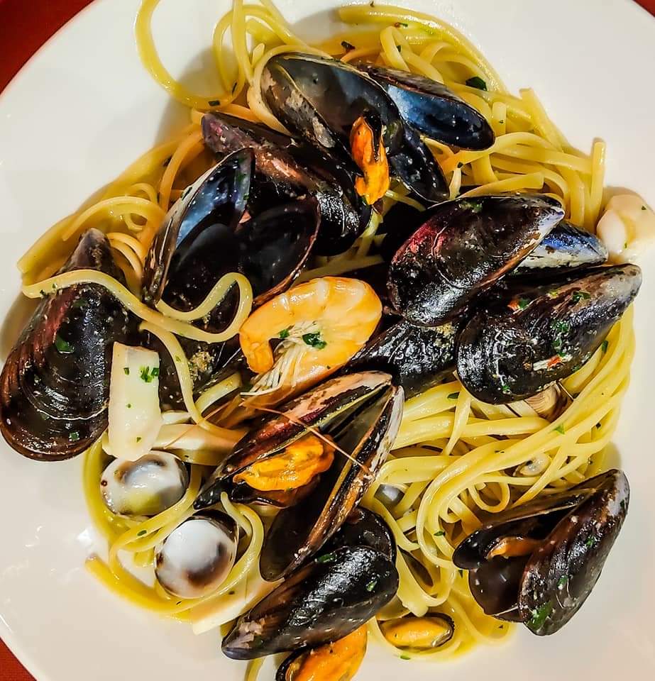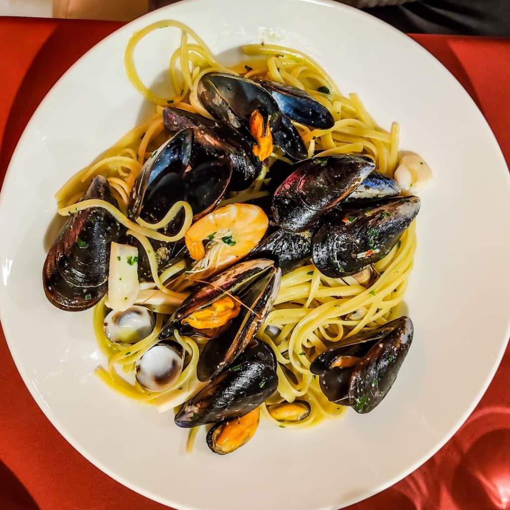 The €19 menu includes tagliolini allo scoglio or seafood carbonara and mixed fried fish and includes water, wine and coffee. There is the possibility of other dishes but with price increases.