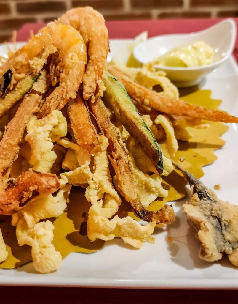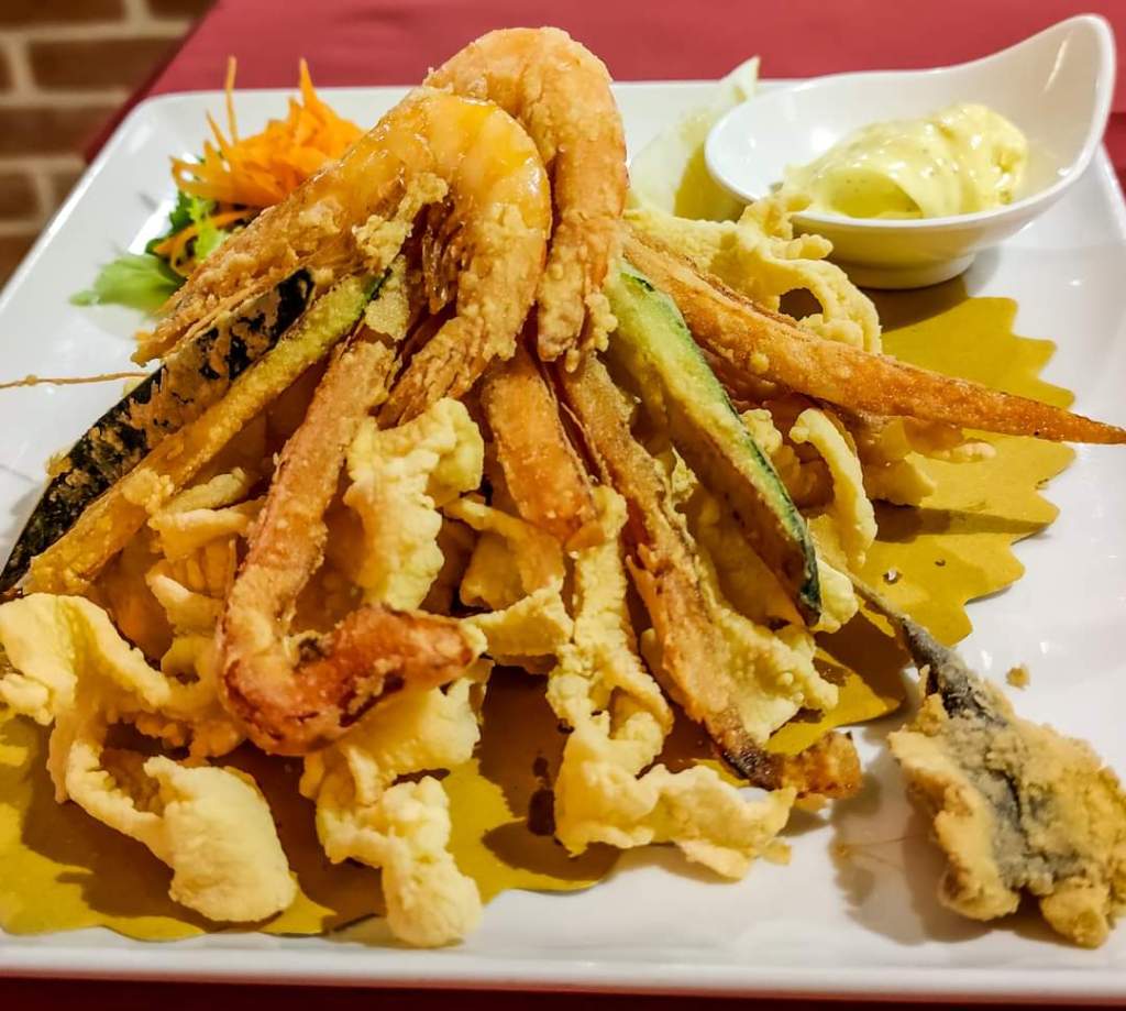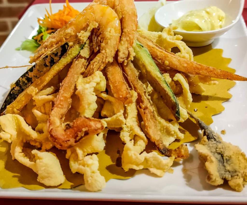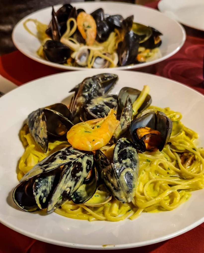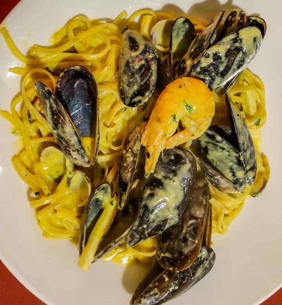 The €19 menu includes tagliolini allo scoglio or seafood carbonara and mixed fried fish and includes water, wine and coffee. There is the possibility of other dishes but with price increases.