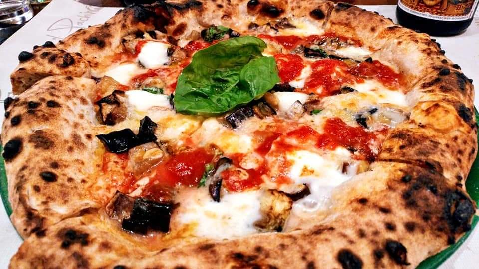 Pizza Parmigiana – Provola di Bufala Campana DOP Affumicata, Cubetti di Melanzana Fritti, Scaglie di Parmigiano DOP, Strisce di San Marzano DOP Eccellenze Nolane.