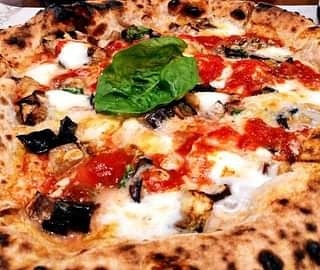 Pizza Parmigiana – Provola di Bufala Campana DOP Smoked, Fried Eggplant Cubes, Parmigiano DOP, Strips of San Marzano DOP Eccellenze Nolane.