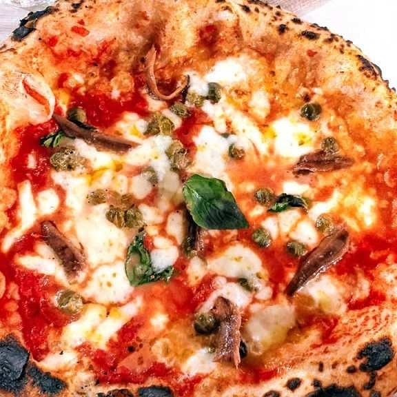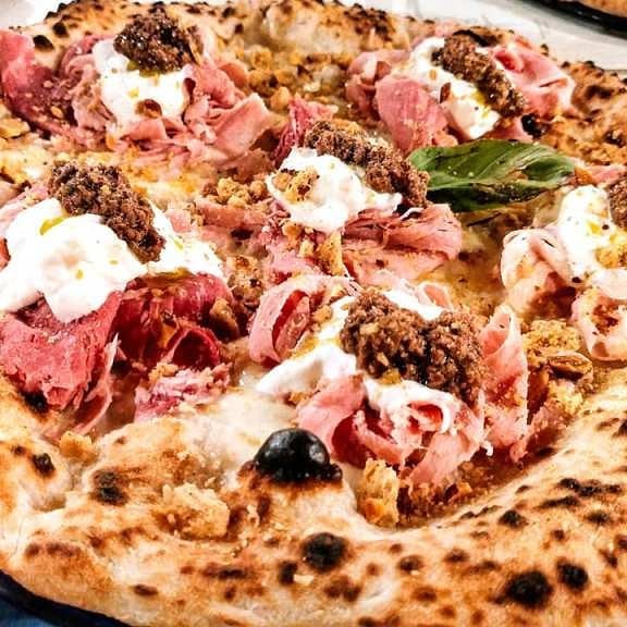 Pizza La Terramare – Fiordilatte di Agerola, Tuna Fillets in Olive Oil, Caramelized Onion Cream, Celery cooked in ice.