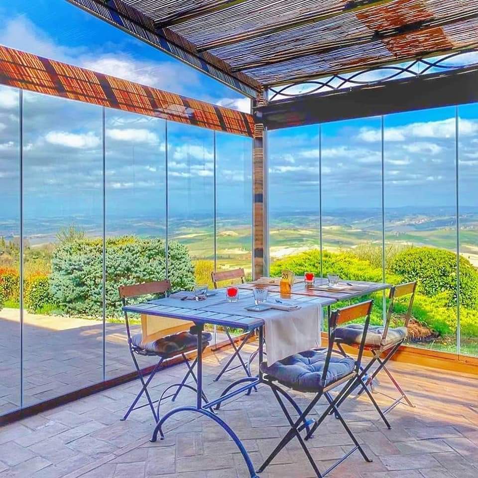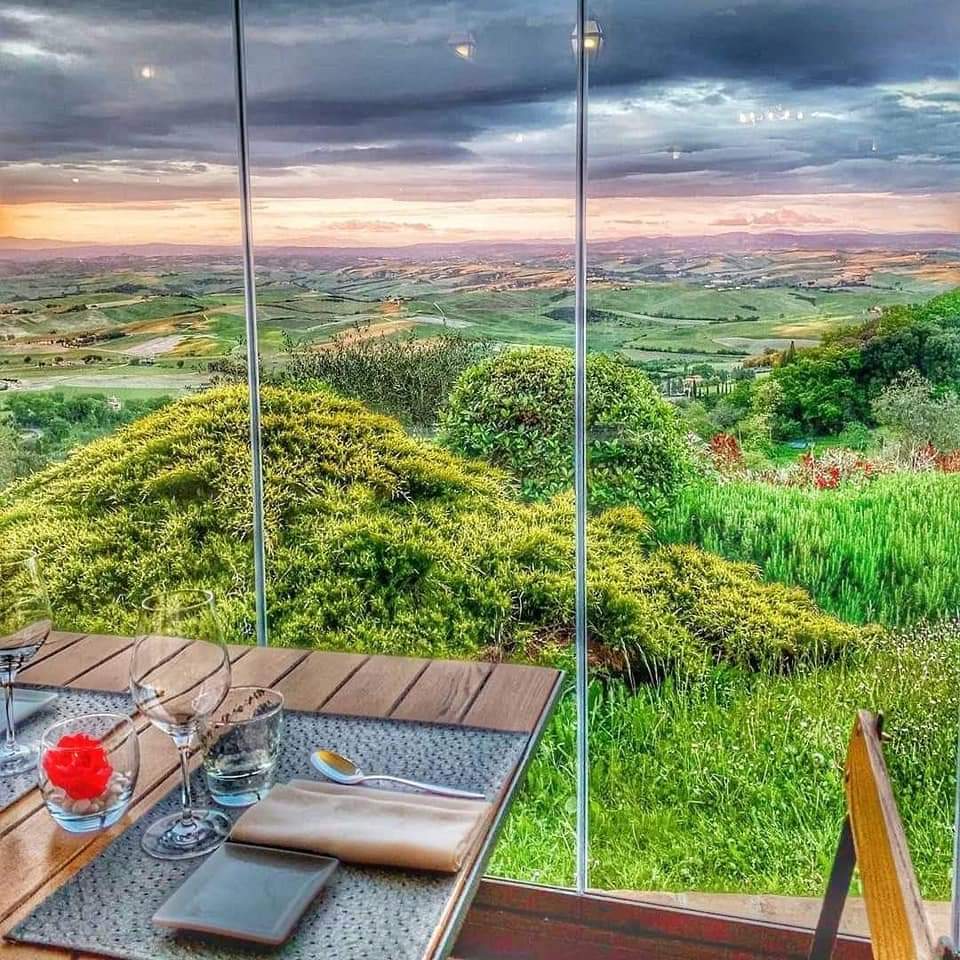 Montalcino. A unique view over the Val D’Orcia. Modernity and Tuscany take shape in the dining room and in the kitchen. Quality and relaxation. Summer terrace not to be missed. Tuscany sunset and panorama come together in the dishes.