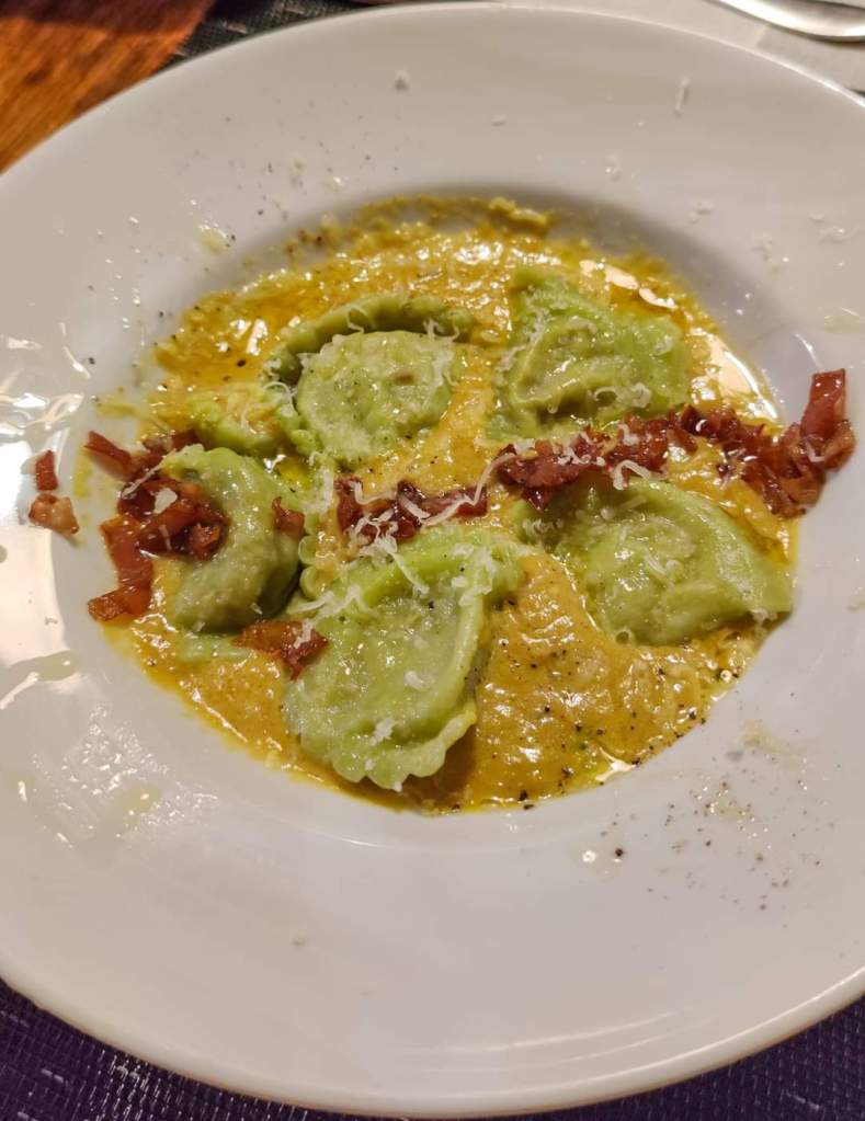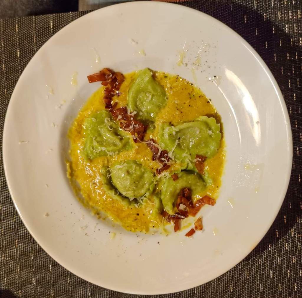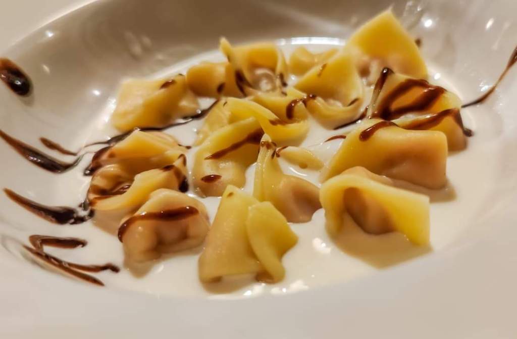 Per lei tortellini del plin fonduta di parmigiano e aceto balsamico, e ravioli ai carciofi e speck, non guardate le foto altrimenti sbavate sul telefono.