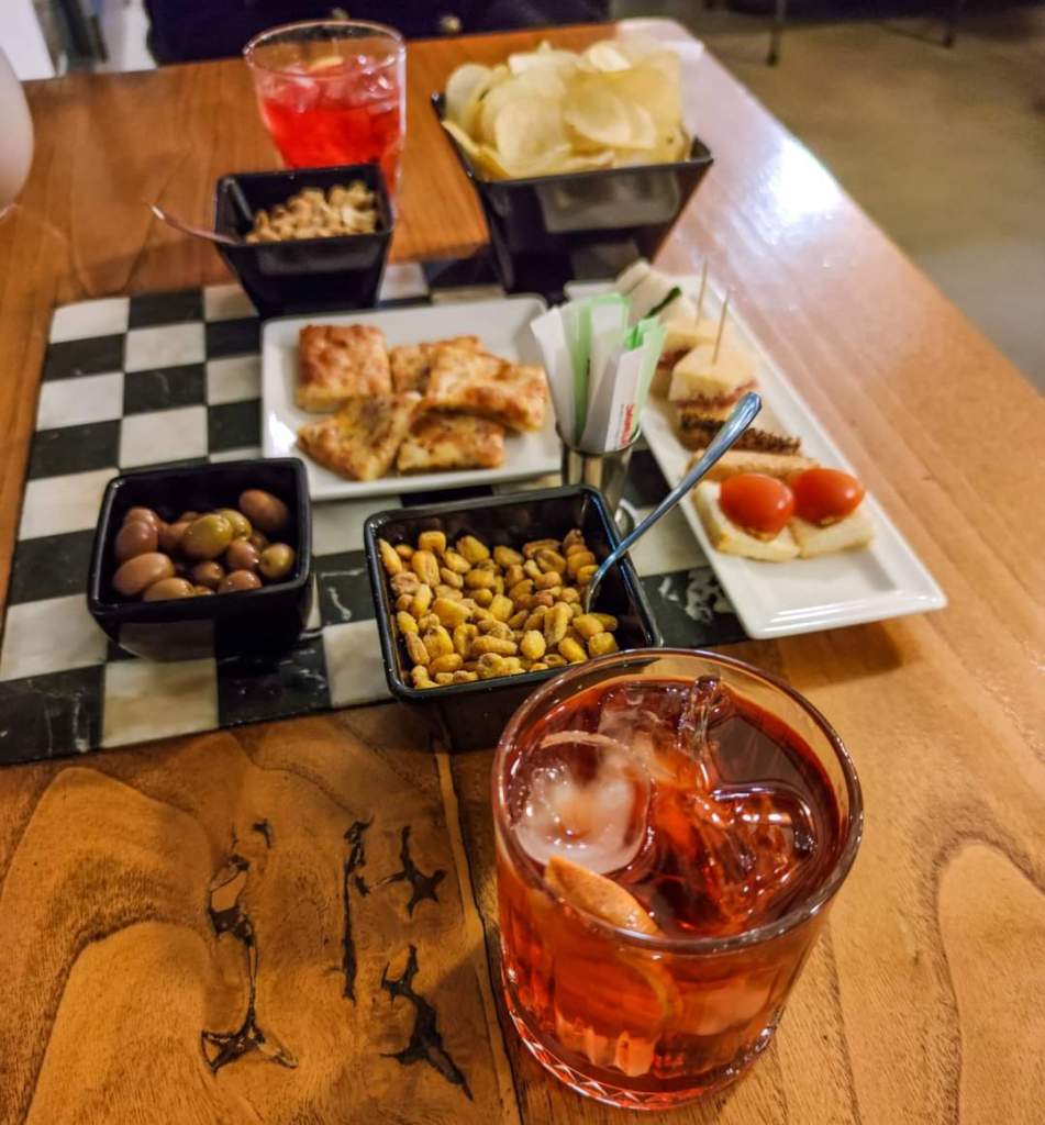 Caffetteria Giardino. Aperitivo come in foto 21 €. Negroni 12 € – Bitter 9 €