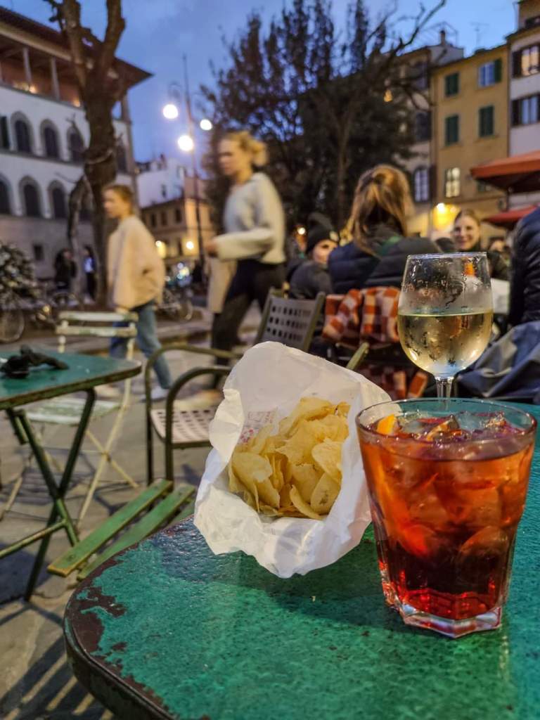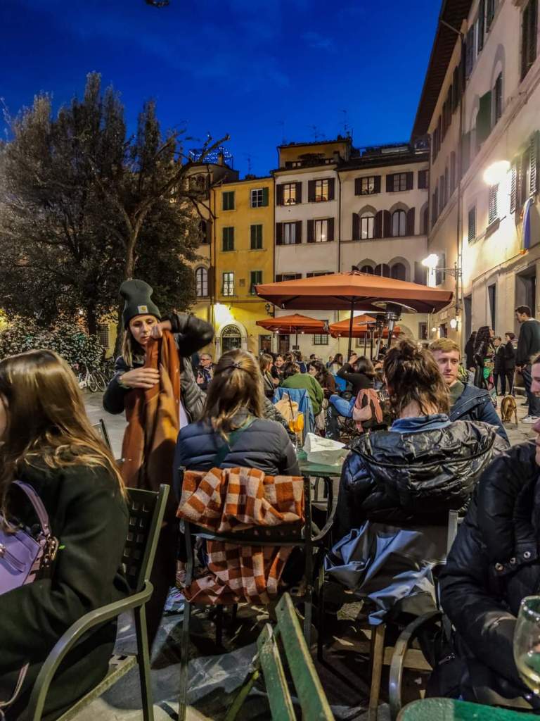 In una delle Piazze più giovani di movida di Firenze.(Piazza Santo Spirito) Localino piccolo che esprime la sua identità nei tavoli in piazza e nella musica giusta a tutto fooo. Negroni 8 € – Vino da 6 €
