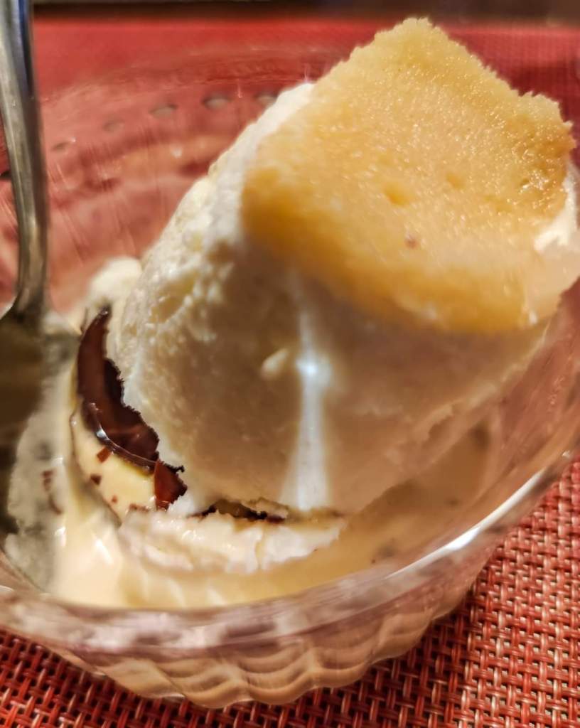 Due belle bocce di vino bianco e rosso che si toccavano per goderne tutti e per finire in bellezza crema gelato che si scioglie con rum e cioccolato, ovvero il Dessert Versilia.