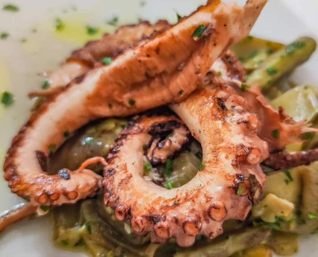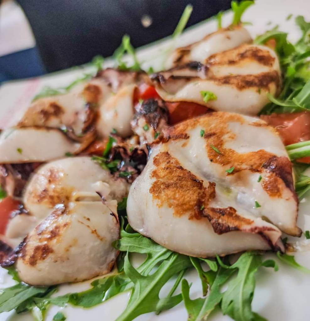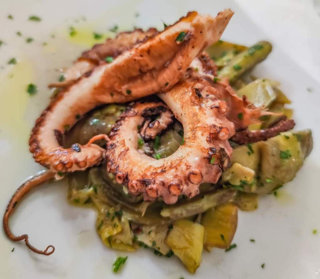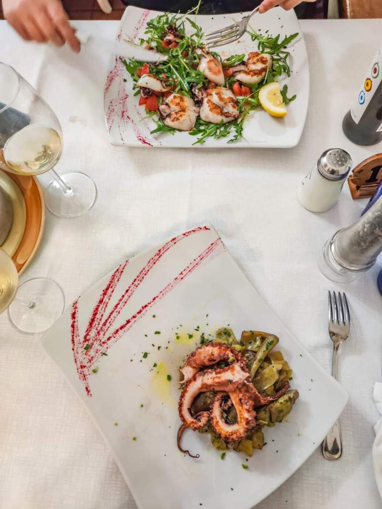 Fish dinner. Paccheri calamari and artichokes, spaghetti with clams, grilled squid and mixed octopus on a bed of artichokes, all washed down with a bottle of house white wine.