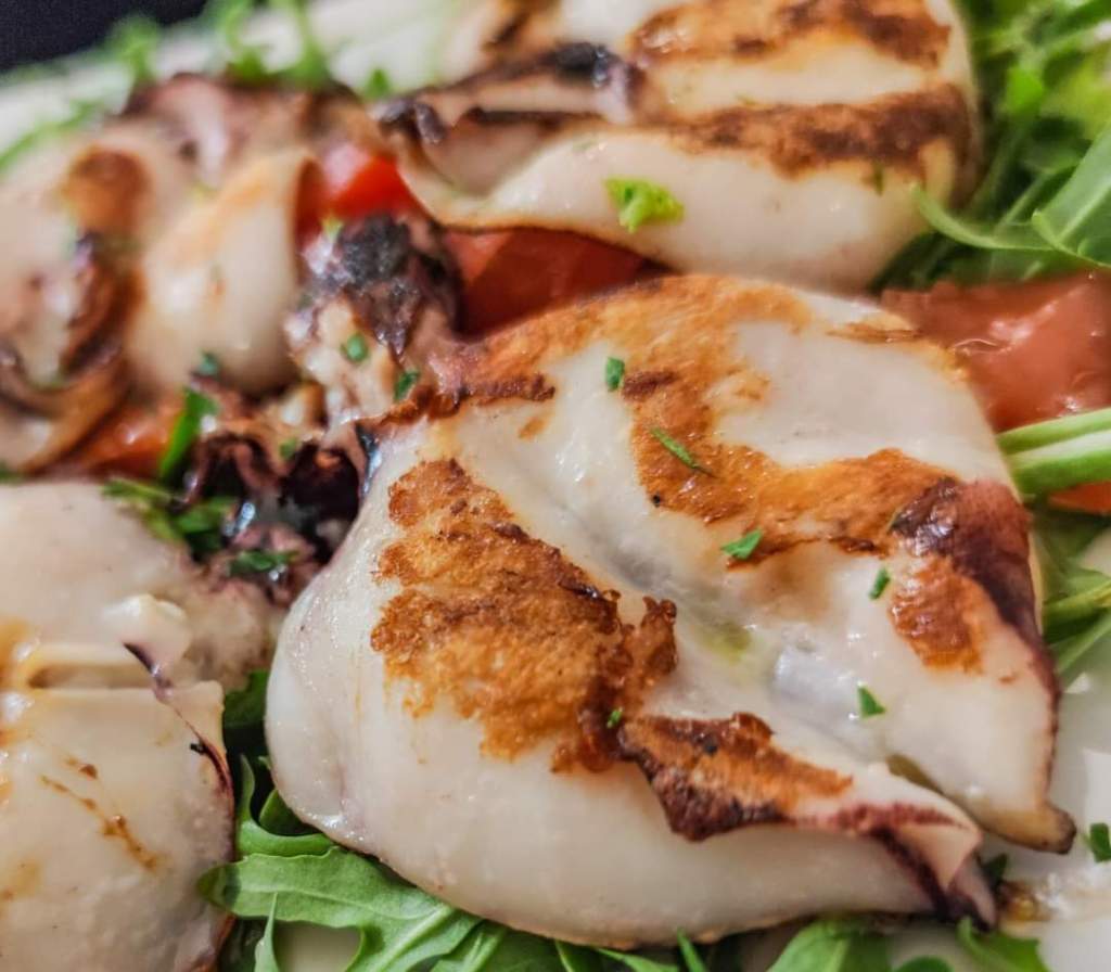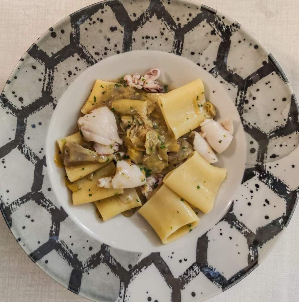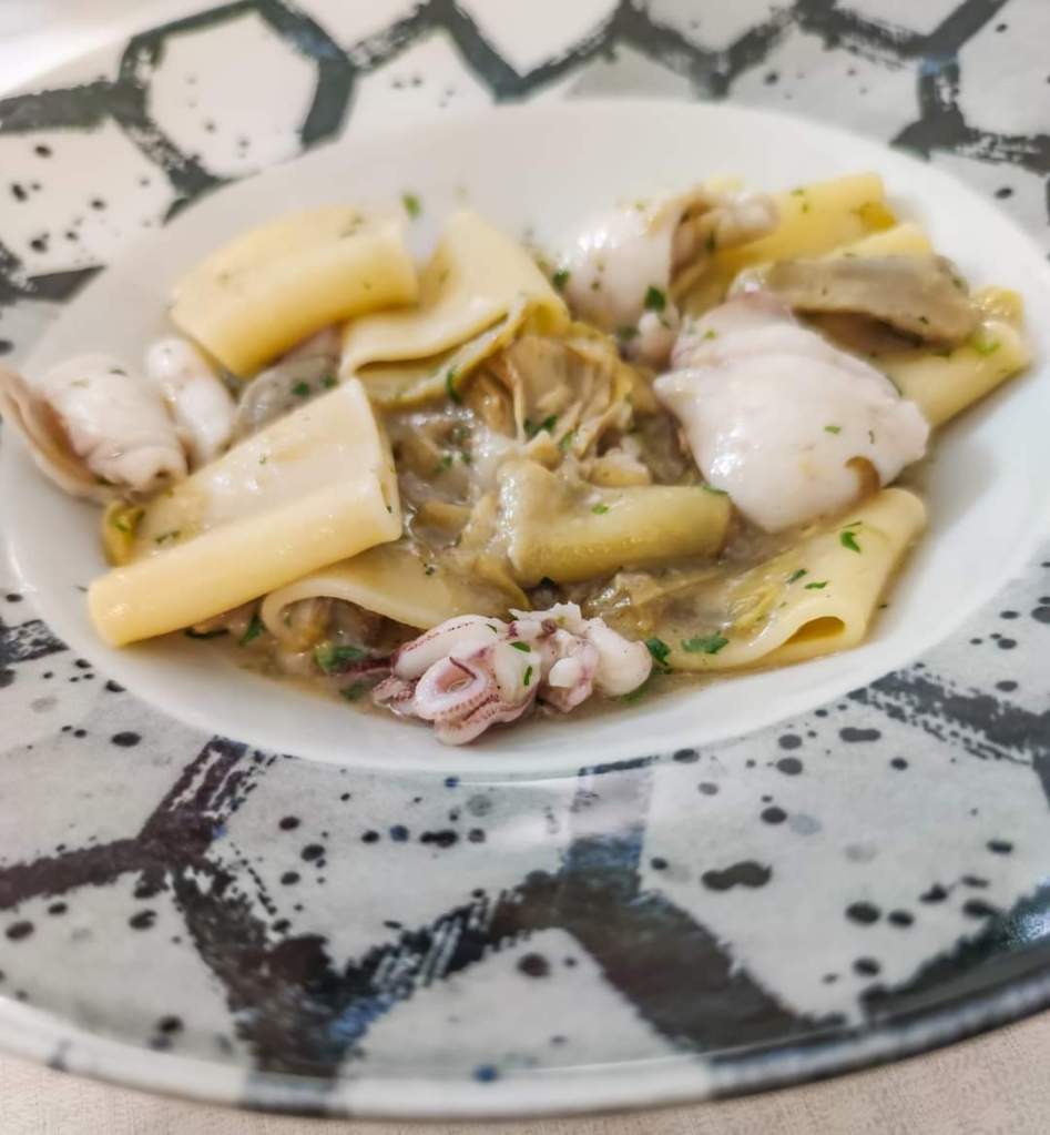 Cena di pesce. Paccheri Calamari e Carciofi, Spaghetti alle Vongole Veraci, Grigliata di Calamari e Polpo misto su letto di Carciofi, il tutto bagnato da una bottiglia di vino bianco della casa.