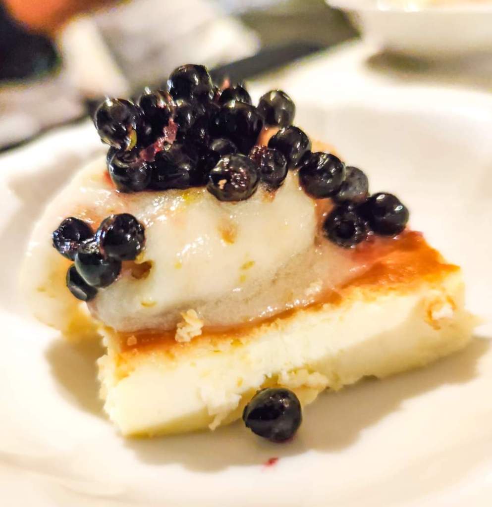 - Torta al formaggio, mirtilli e sorbetto alle pere.