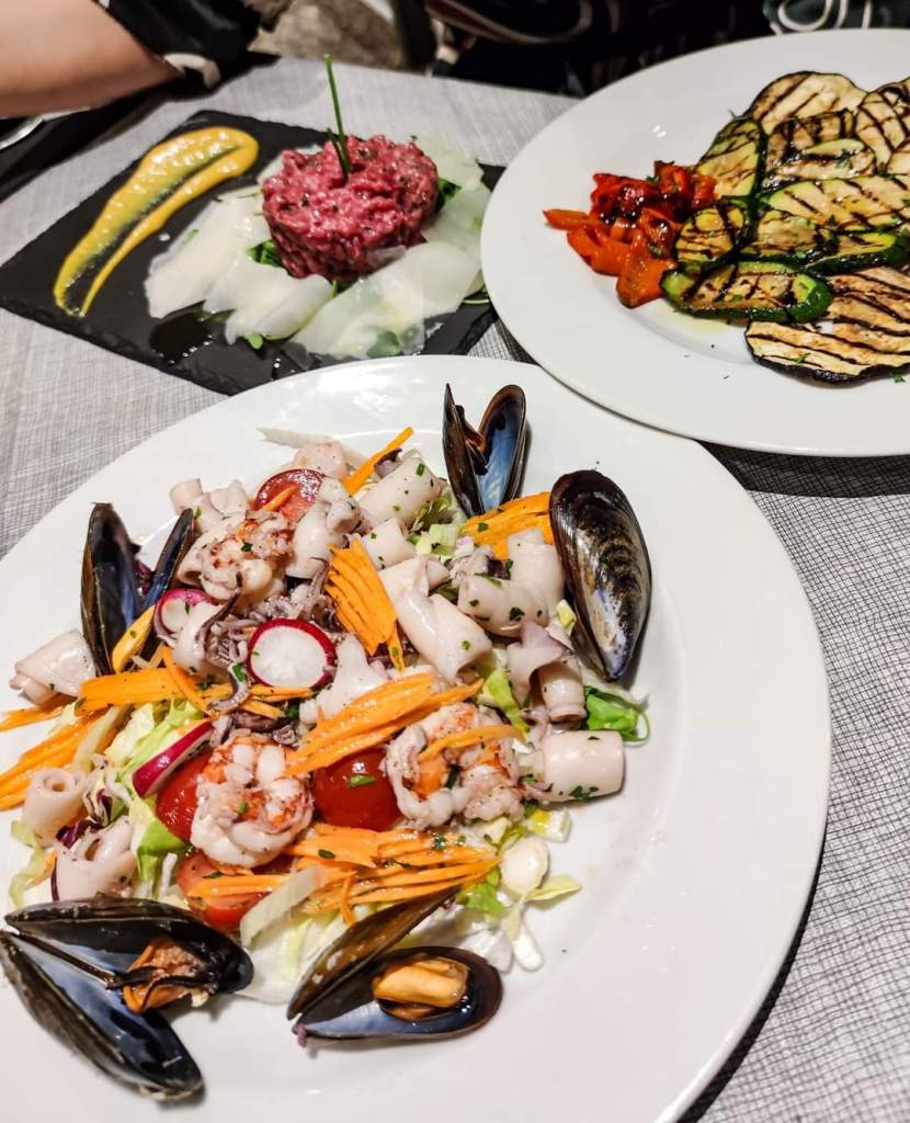 Last night at Mirco’s pizzeria to taste his cuisine. A seafood salad, a tartare, grilled vegetables, wine and dessert. Spending €20 per person.