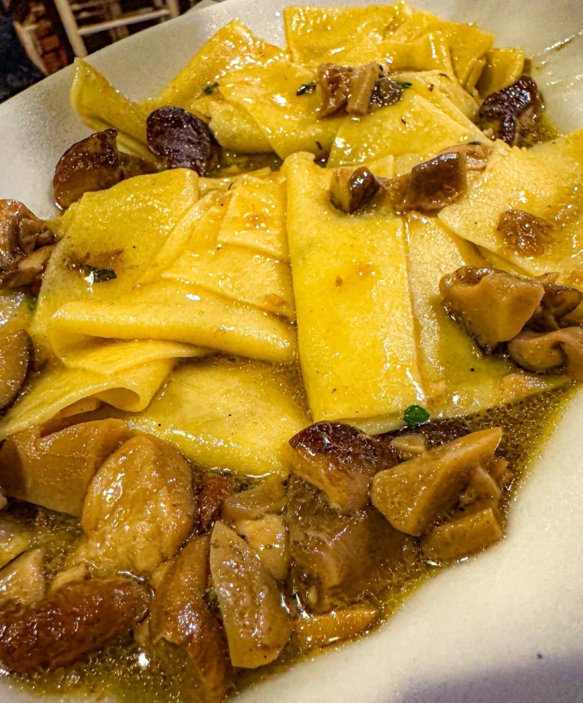 Last night, craving mushrooms and following a recommendation, we decided to try “Il Mattarello” for the first time, located in the small village of Torcigliano. Upon arrival, we were greeted by a beautiful panoramic terrace, with well-arranged tables and a very pleasant and relaxing atmosphere.