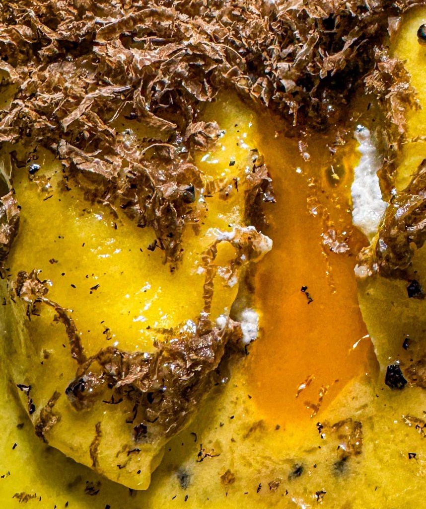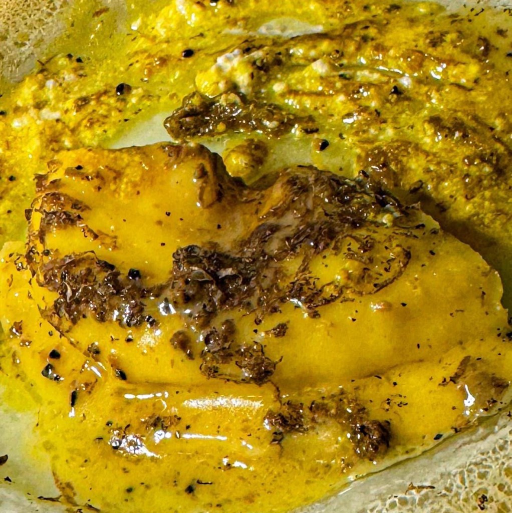Uovo in raviolo con burro tartufato e tartufo estivo.