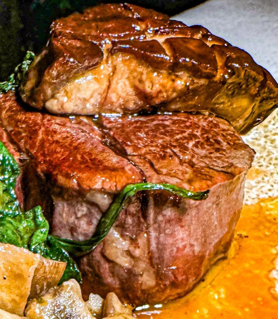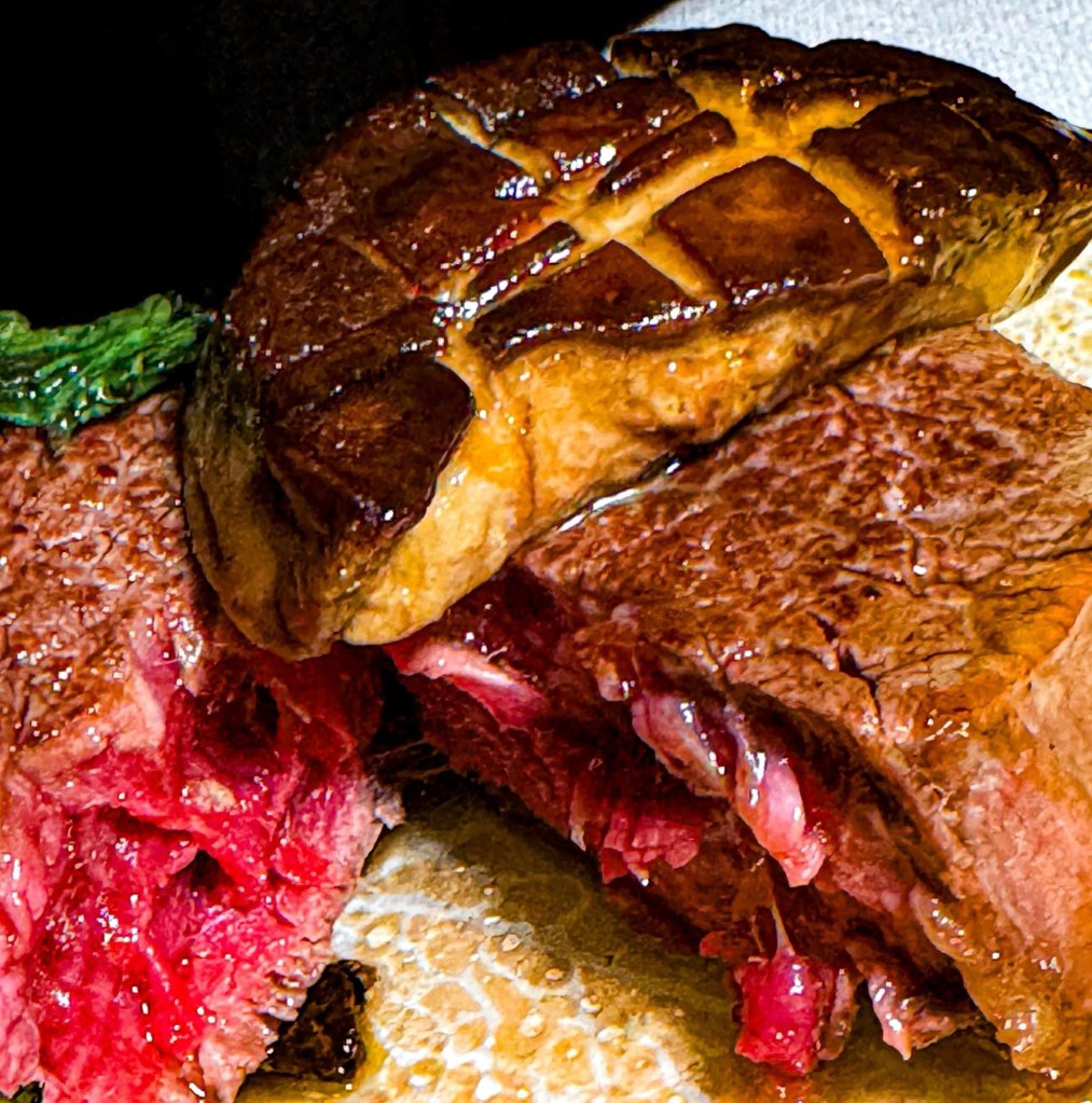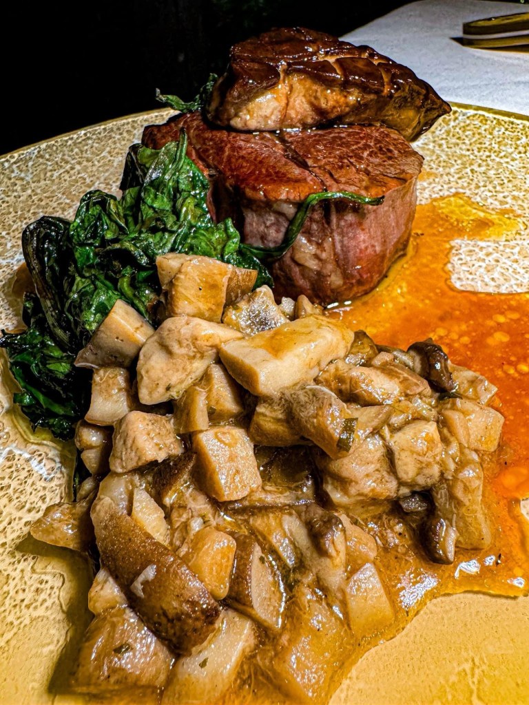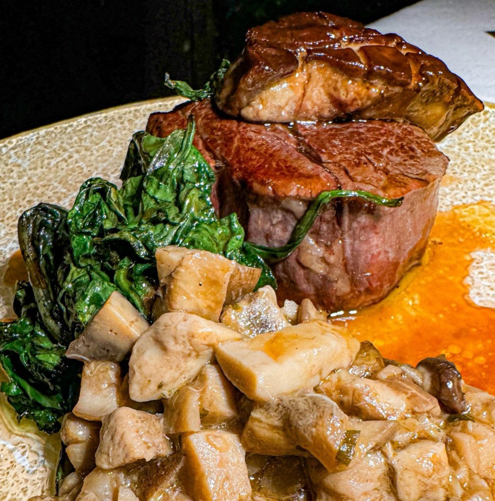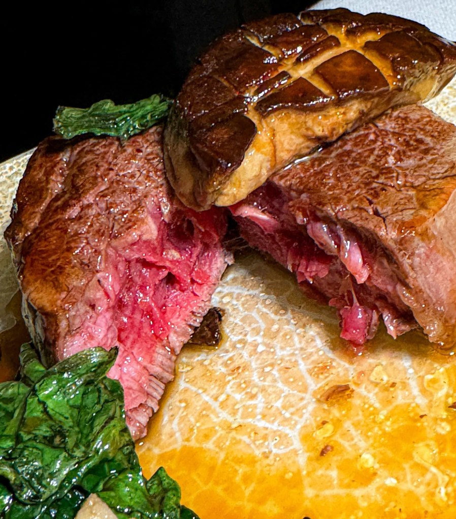 Filetto di manzo con scaloppa di foie gras, funghi porcini e spinaci.