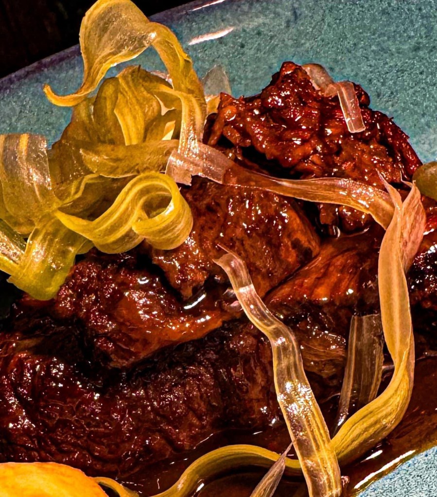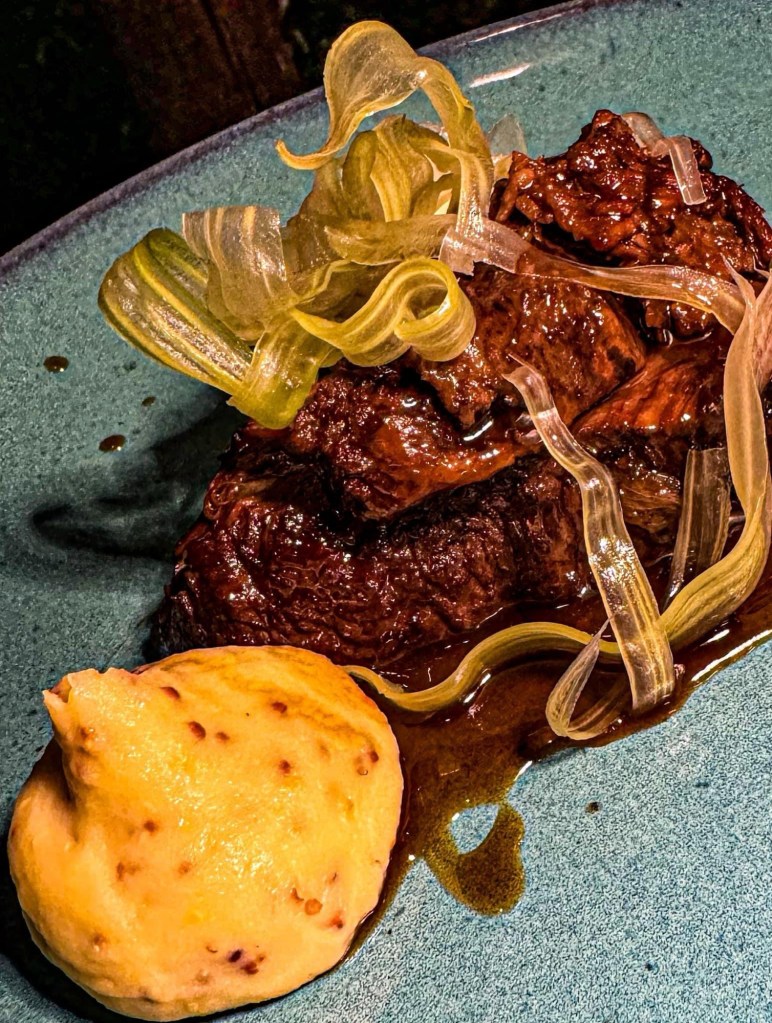 Guancia di vitello brasata con sedano croccante e purè alla senape.
