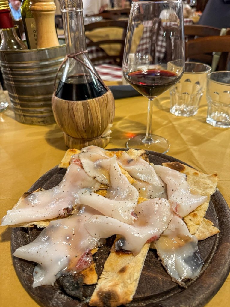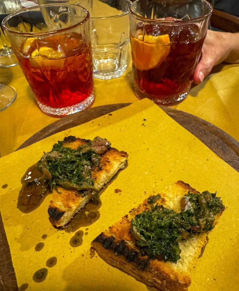 Warm focaccia with lard, a translucent orgasm of fat and crunch, pure ecstasy that slides down your throat. Toasted bread with fresh sausage, a bite of life—intense, shameless—that grabs you without mercy. Stefano’s lasagna? Pure indulgence, layers of pleasure where meat and béchamel come together in an indecent embrace. And then the pici with truffle, a dirty poem that takes you deep into the earth, with aromatic shavings bathed in buttery cream. The salt cod with chickpeas? Meaty, honest, a mouthful of the sea that knows no compromise, genuine to the core.