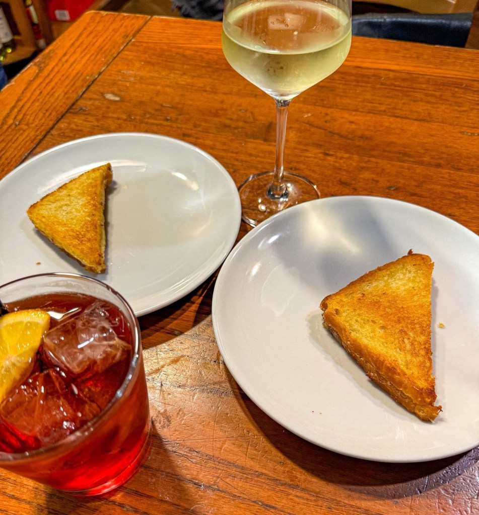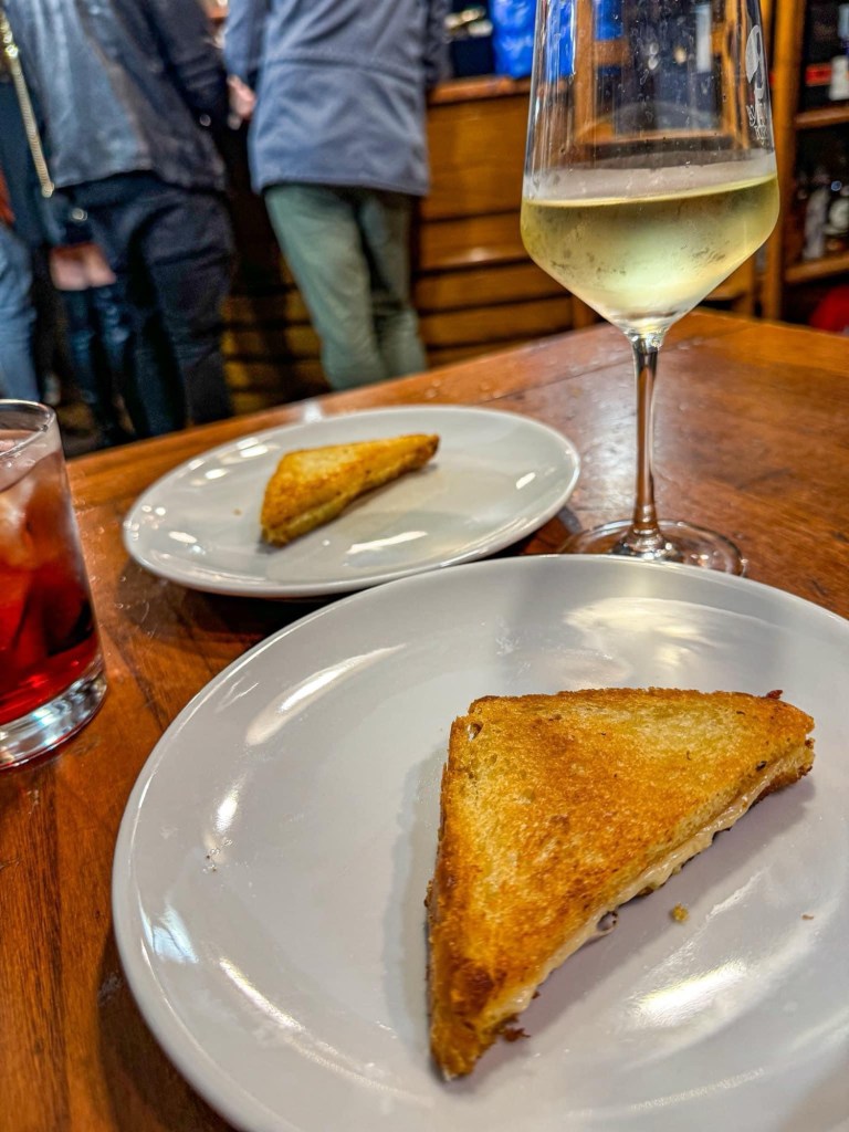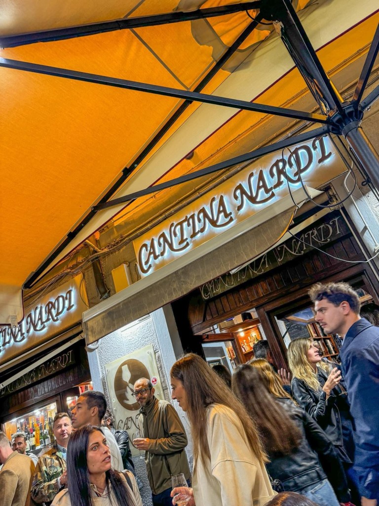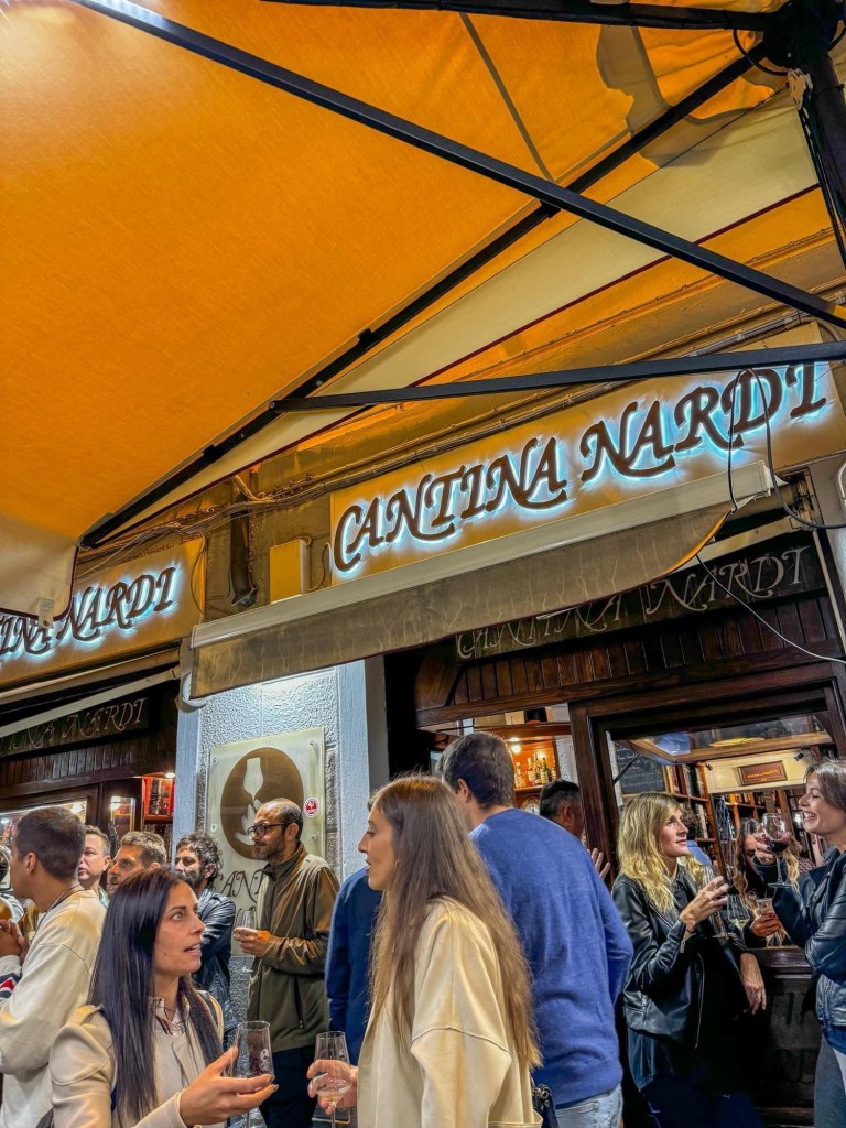 Qui non parliamo di ambienti formali con luci soffuse e camerieri vestiti come pinguini. Questo è il Triangolino del Nardi, un atto di ribellione culinaria che si consuma in piedi, bicchiere di vino in mano lei, Negroni io, perché sono ottuso, tra chiacchiere e risate, ma sono anziano e mi sono messo anche a sedere…..ma ti stai comunque rilassando tra la folla, e l’unica cosa che ti importa è il sapore esplosivo di quel morso perfetto. È una dichiarazione: il lusso vero non sta nelle forme complicate o nelle parole vuote, ma in un pezzo di pancarrè tostato, prosciutto, formaggio, burro e tanta, tanta anima.