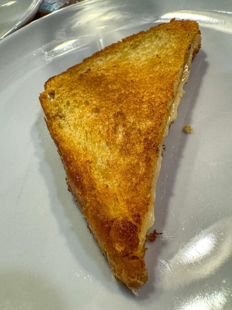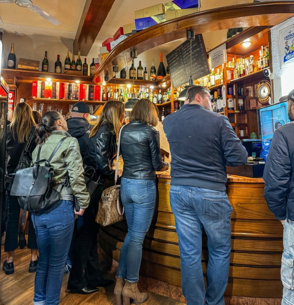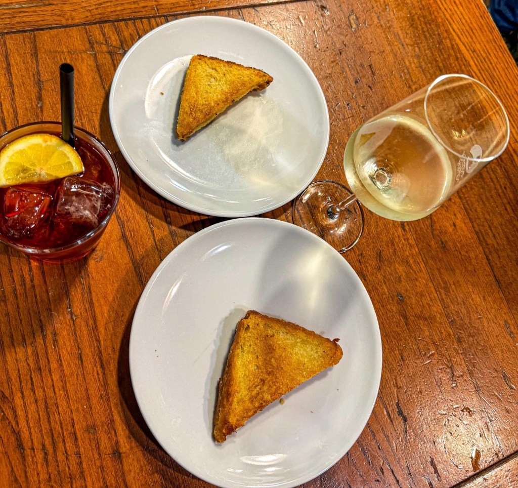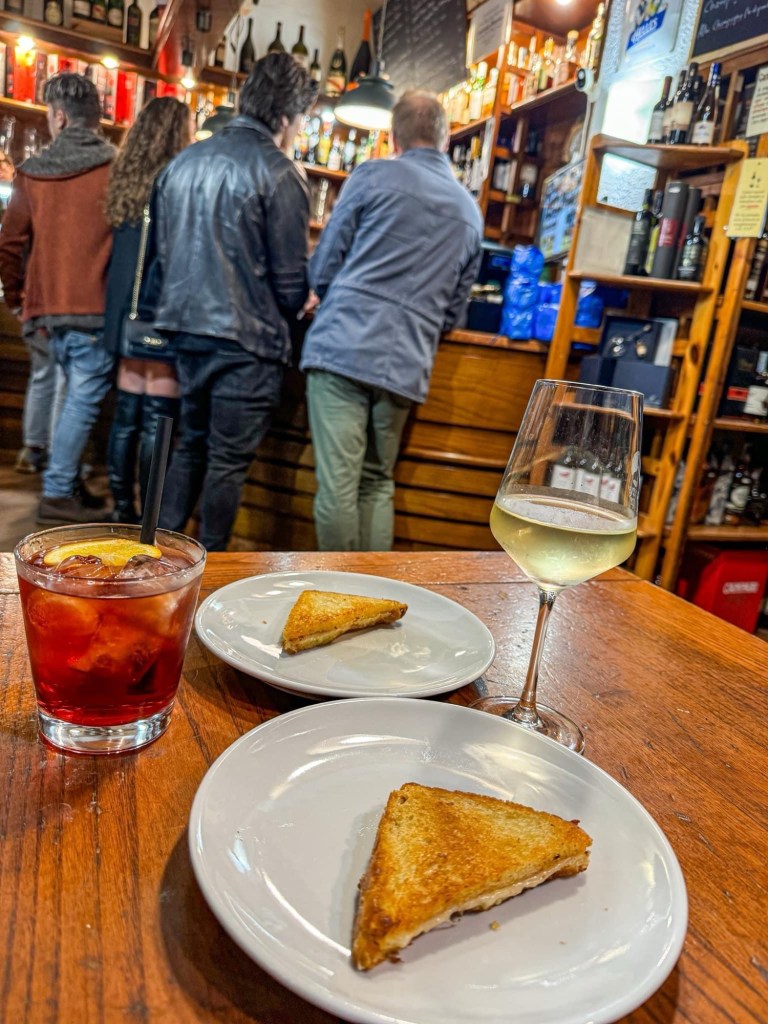Qui non parliamo di ambienti formali con luci soffuse e camerieri vestiti come pinguini. Questo è il Triangolino del Nardi, un atto di ribellione culinaria che si consuma in piedi, bicchiere di vino in mano lei, Negroni io, perché sono ottuso, tra chiacchiere e risate, ma sono anziano e mi sono messo anche a sedere…..ma ti stai comunque rilassando tra la folla, e l’unica cosa che ti importa è il sapore esplosivo di quel morso perfetto. È una dichiarazione: il lusso vero non sta nelle forme complicate o nelle parole vuote, ma in un pezzo di pancarrè tostato, prosciutto, formaggio, burro e tanta, tanta anima.