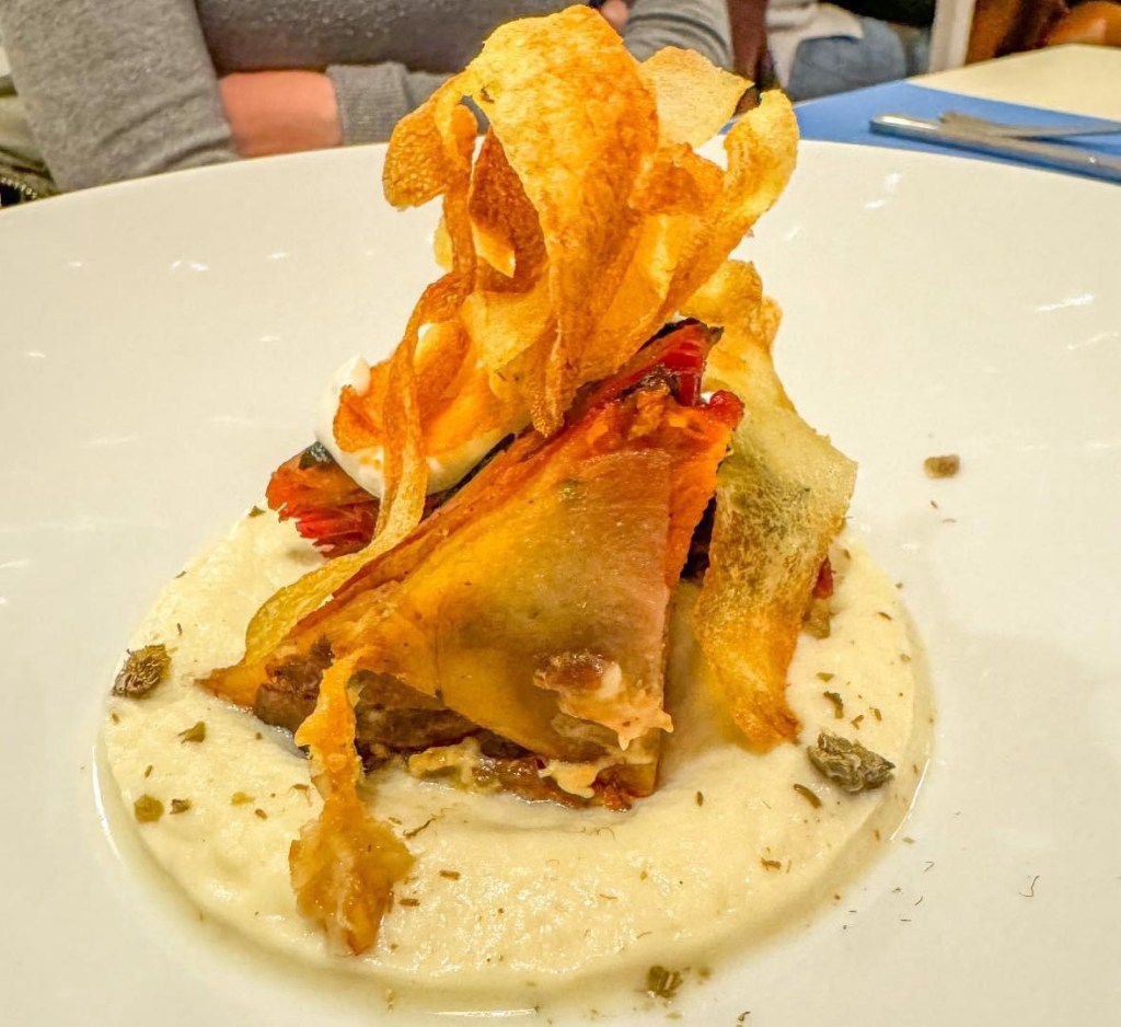 Questo piatto è pura architettura gastronomica. Gli strati di zucca, patata e barbabietola creano una sinfonia di dolcezza e terra, con l’alga nori che introduce una sorprendente nota marina. La vellutata di cavolfiore, morbida e raffinata, funge da base ideale, mentre l’emulsione all’erba cipollina e le chips di patate aggiungono croccantezza e freschezza. Un gioco di consistenze e sapori che riesce a stupire senza mai risultare eccessivo.