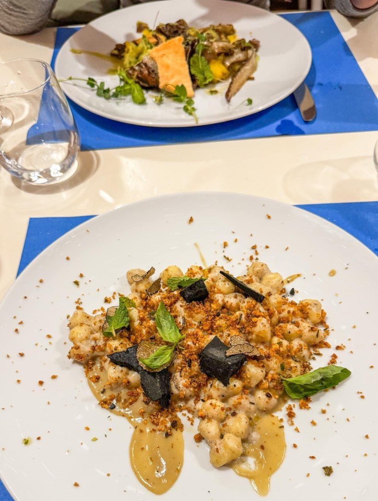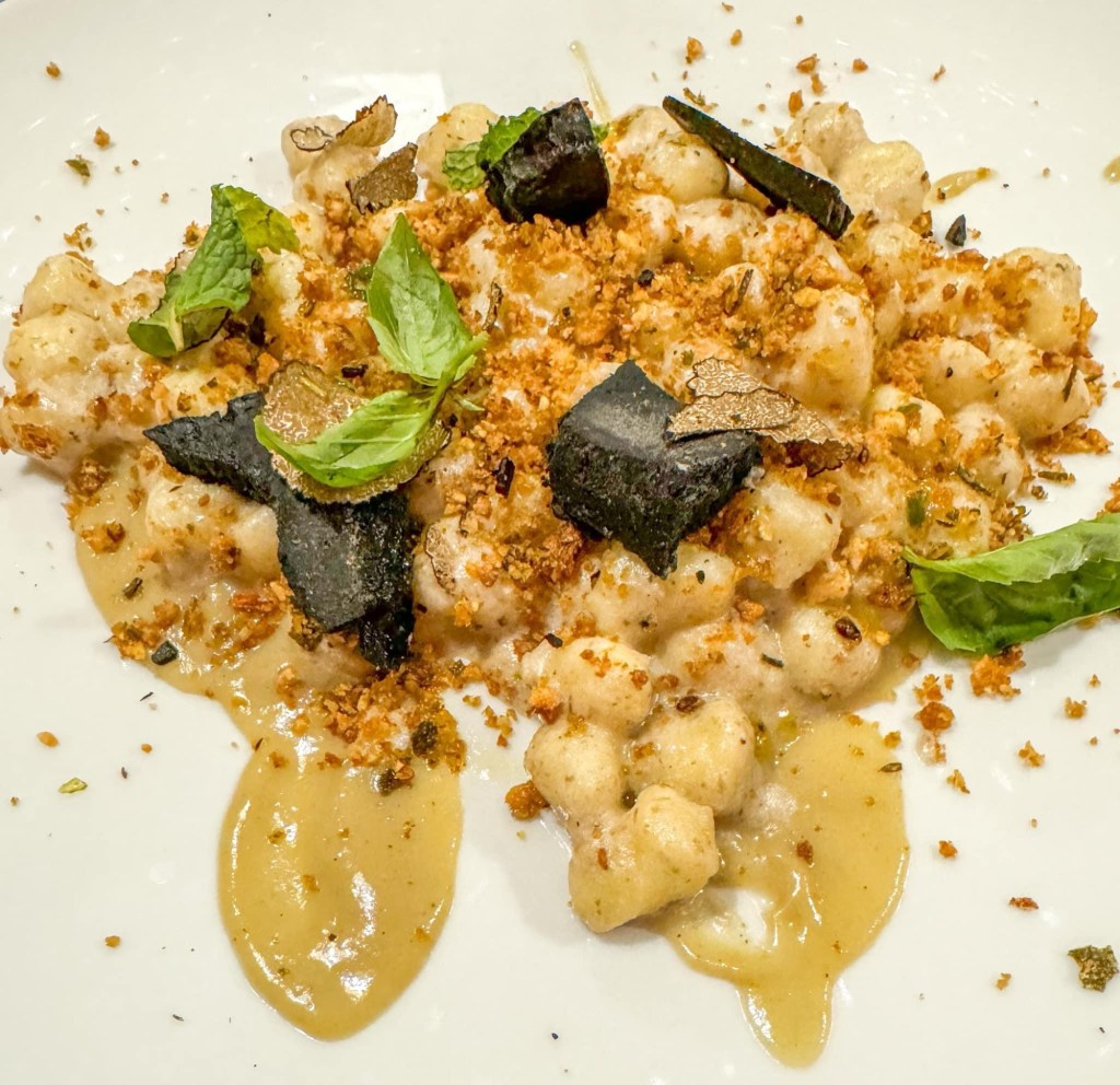 • Gnocchetti fatti in casa mantecati con tartufo uncinato su crema d’aglione cotto a bassa temperatura, burro di mandorle, erbette di campo e formaggio di carbone vegetale