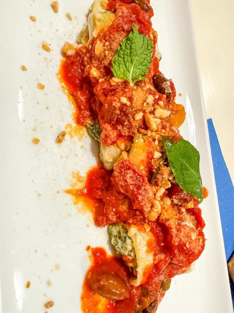 • Paccheri ripieni di ricotta di anacardi e spinaci con salsa di pomodorini pachino, olive taggiasche, capperi e besciamella di riso