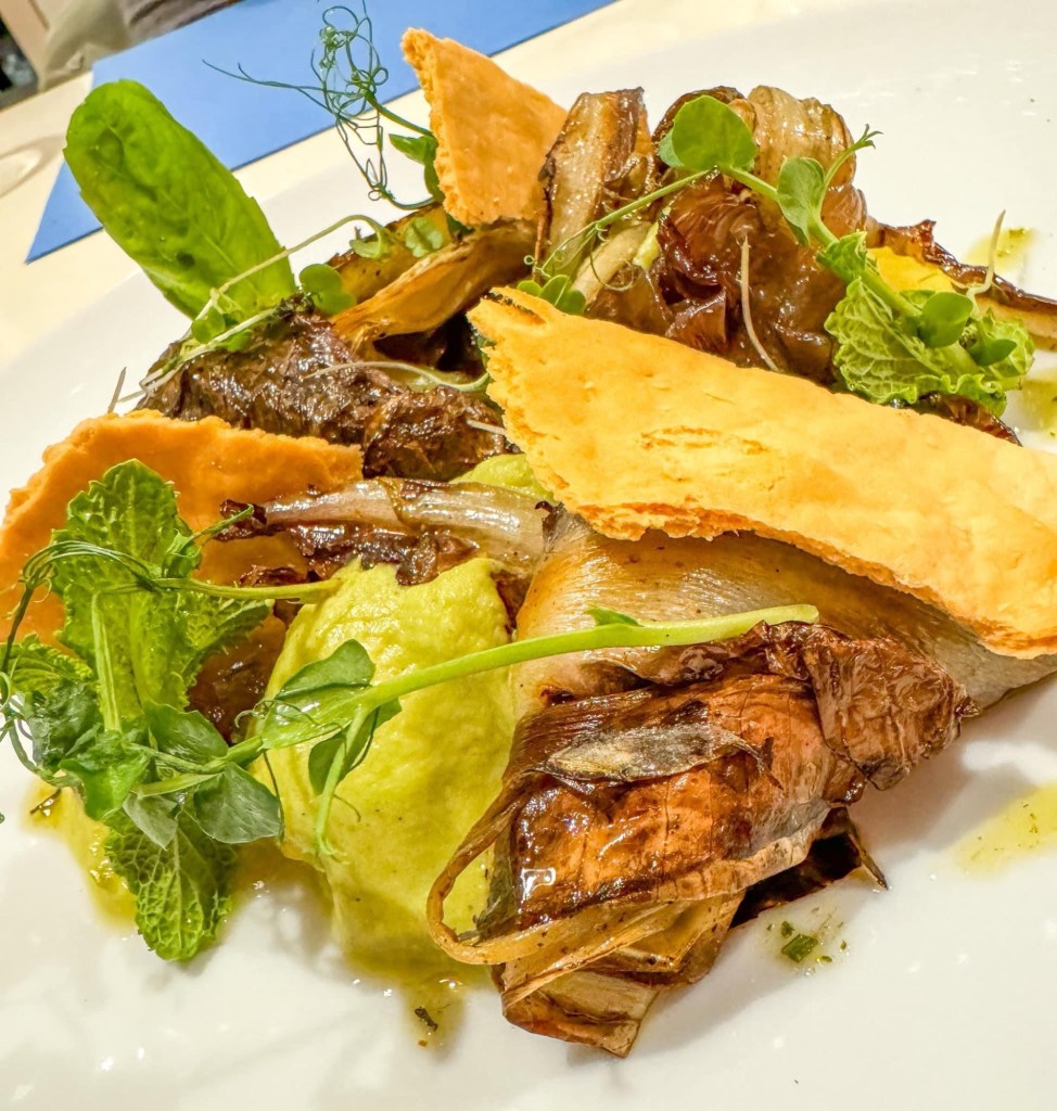 Gli gnocchetti al tartufo sono un autentico inno al piacere. Il tartufo uncinato è presente ma equilibrato, mentre la crema d’aglione cotto a bassa temperatura esplode in bocca con una dolcezza vellutata, controbilanciata dalle note del burro di mandorle e delle erbette di campo. Il tocco finale del formaggio di carbone vegetale, con la sua leggera affumicatura, dona al piatto una profondità quasi primordiale. Un’esperienza di puro godimento.