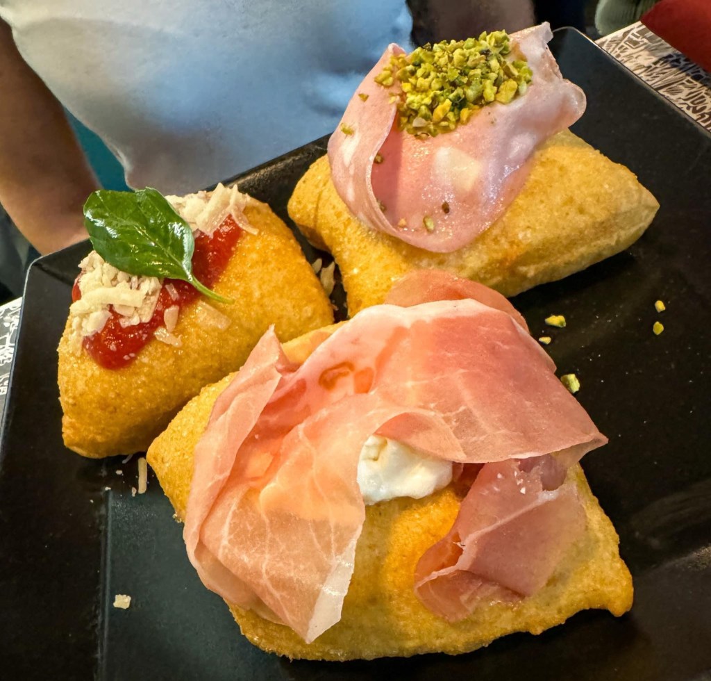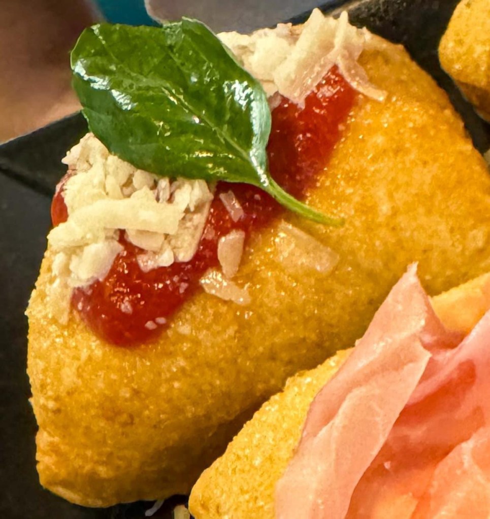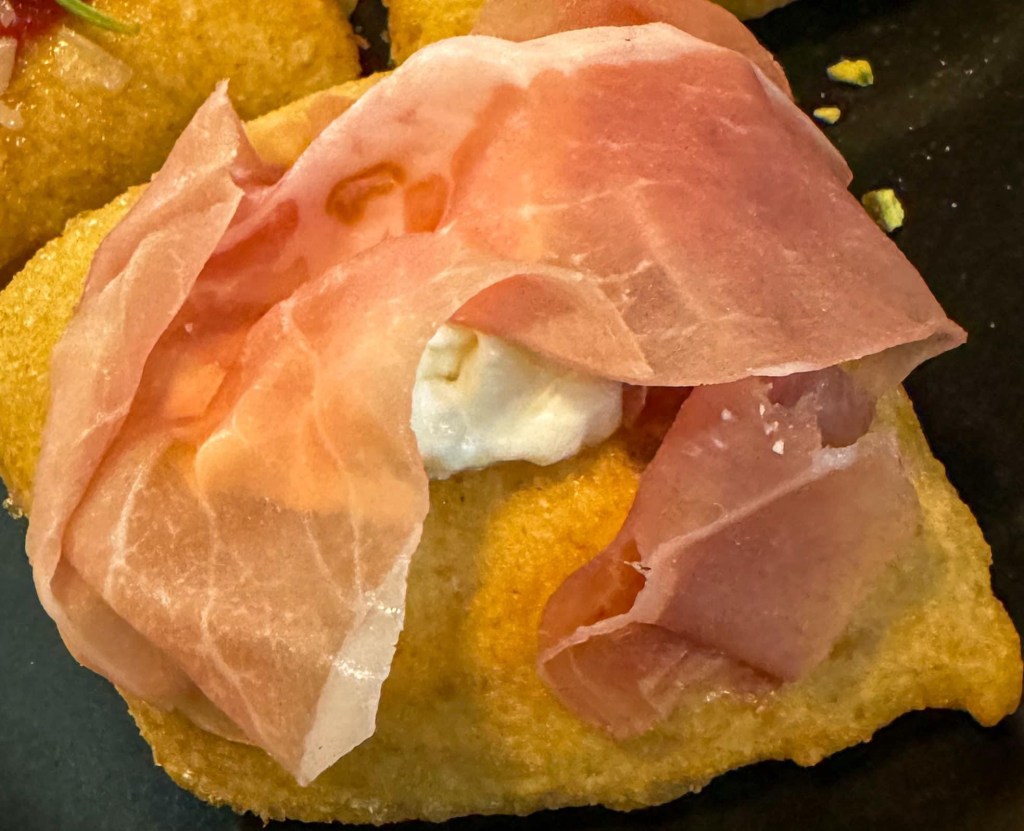La Zeppola, servita con formaggio cremoso e prosciutto crudo, un abbinamento che unisce la delicatezza del formaggio alla sapidità del prosciutto.