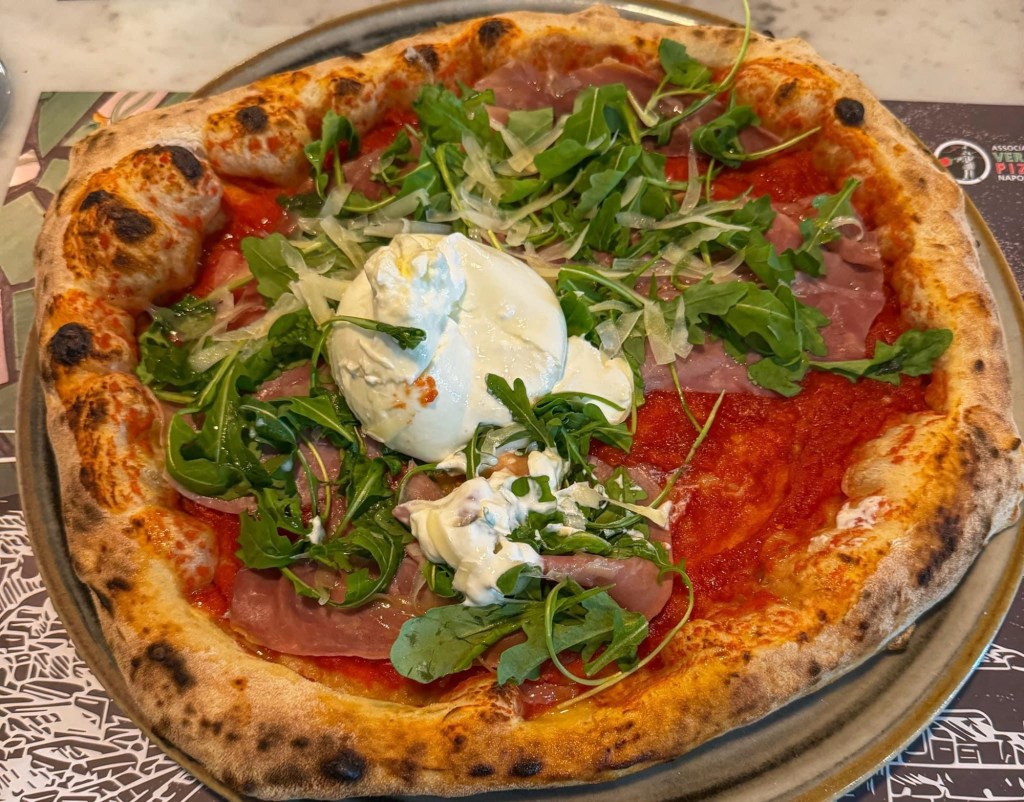 La Pizza Fuorigrotta, base di pomodoro, a cui, una volta uscita dal forno, vengono aggiunti mozzarella di bufala intera, prosciutto crudo, scaglie di pecorino e rucola fresca. Piacevole il contrasto tra la dolcezza della bufala e il sapore deciso del pecorino, unito alla freschezza della rucola.